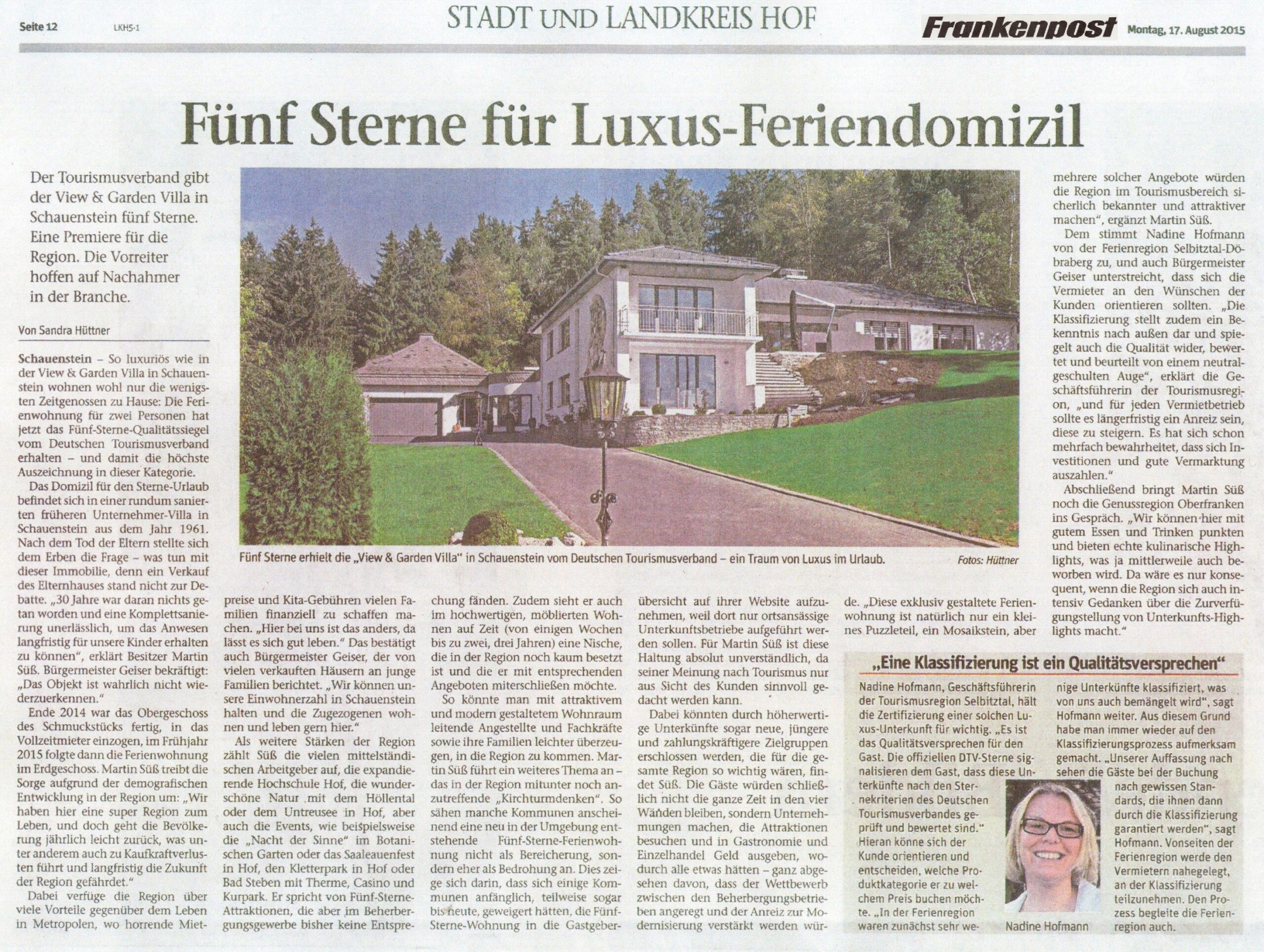 Frankenpost-Artikel zur Verleihung von 5 DTV-Sternen an die View & Garden Villa Schauenstein